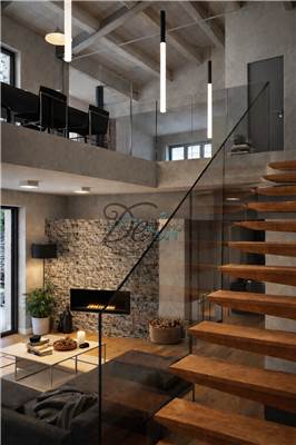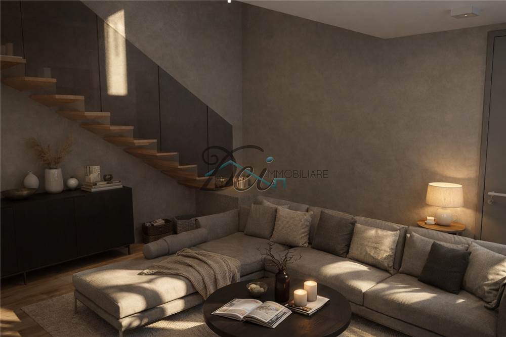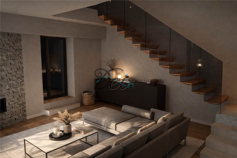 Ground Floor – The entrance leads to a bright living area with a bioethanol fireplace and a view of the elegant wooden staircase leading to the first floor. The ground floor houses the master bedroom, complete with bathroom with tub, shower, and walk-in closet. A second double bedroom with bathroom and a twin bedroom with bathroom complete the sleeping area. The ground floor also provides access to the 30 square meter basement garage.